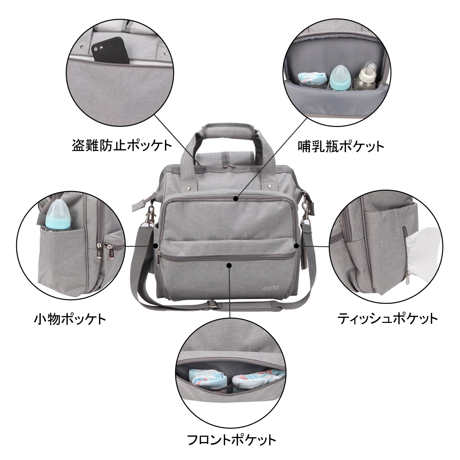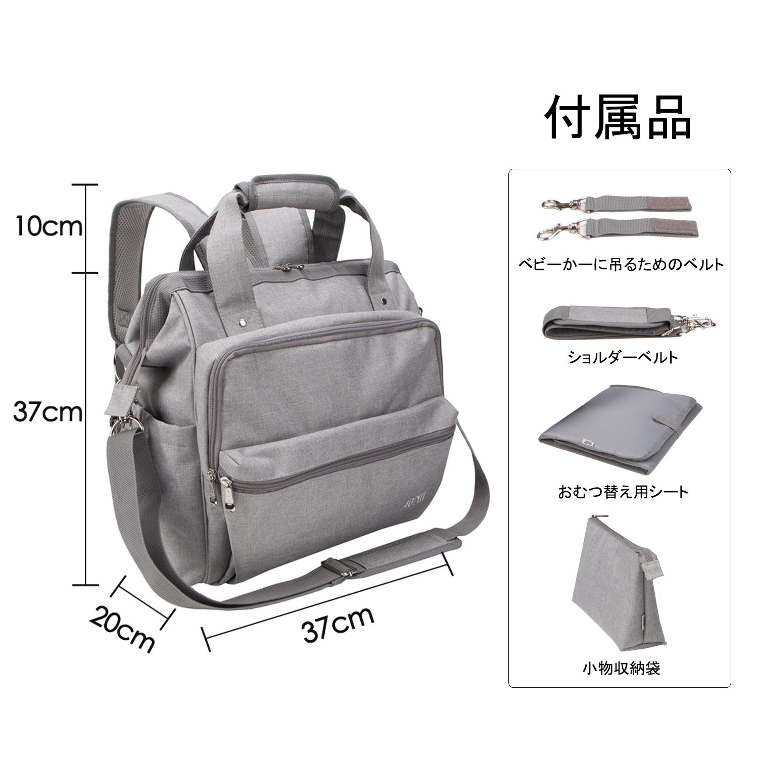 A seat that can change diapers anywhere, a shoulder belt (115 cm in length) that can be hung diagonally, a belt that can be hung on a baby cage, a pocket that can hold accessories such as cosmetics / wallet / smartphone / key.