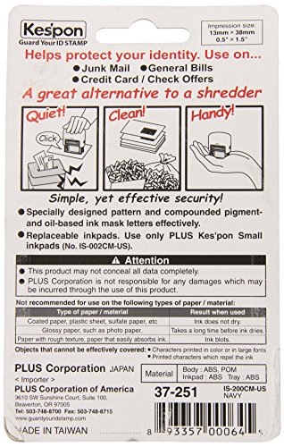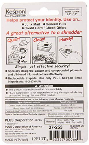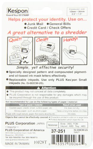 -. Binding : Office Product -. Brand : Plus -. Feature : Quickly stamp over your personal information / A safe alternative to a paper shredder / Approximately 1,000 impressions per ink pad -. Label : PLUS Corporation of America -. Manufacturer : PLUS Corporation of America -. PackageQuantity : 1 -. ProductGroup : Office Product -. ProductTypeName : OFFICE_PRODUCTS -. Publisher : PLUS Corporation of America -. SKU : 37-smstamp -. Studio : PLUS Corporation of America -. Title : Guard Your ID Small Stamp