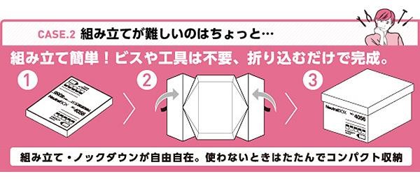 ビスや工具なしに折り込むだけで完成する、組み立て簡単の収納ボックスです。衣類やおもちゃなどの収納・整理に。