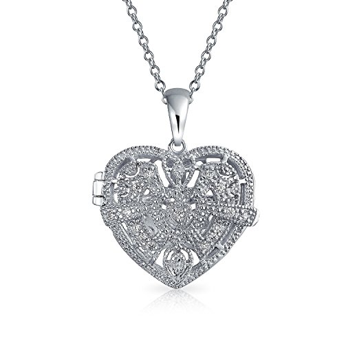 Silver heart lockets are the most timeless accessory because you can carry two photos close to your heart. The sparkling 0.94in pendant is vintage style, with rhodium plating and pave CZ. This charm features a filigree pattern, and hangs from an 18in chain.