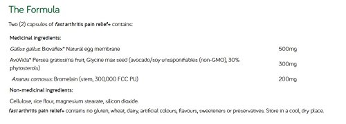 -. Feature : Increased range of motion joint mobility & joint space lost of arthritis / Helps build joint cartilage and provide important nutrients for joint repair / Natural anti-inflammatory, providing more support for this common component of joint pain / Helps in relieving pain due to arthritis in as little as 5 days (compared to 10-30 days for Glucosamine) About the robust ingredients found in fast arthritis pain relief+: • AvoVida® Research-proven to increase joint space lost from degenerative changes in osteoarthritis. • Bromelain a natural enzyme found in pineapples, which is highly anti-inflammatory and provides superior support for common components of joint pain, and highly problematic symp of arthritis. / Derived from egg shells, Biovaflex® natural egg membrane feeds your body all essential nutrients for proper joint health and flexibility, including glucosamine, chondroitin sulfate, collagen, elastin and other proteins. When taken daily, fast arthritis pain relief+ prevents and treats joint pain, while providing cartilage building and reducing inflammatory markers like C Reactive protein.