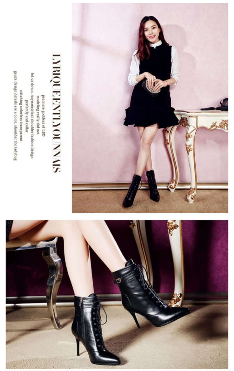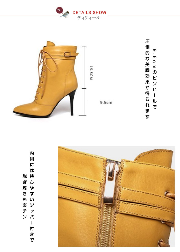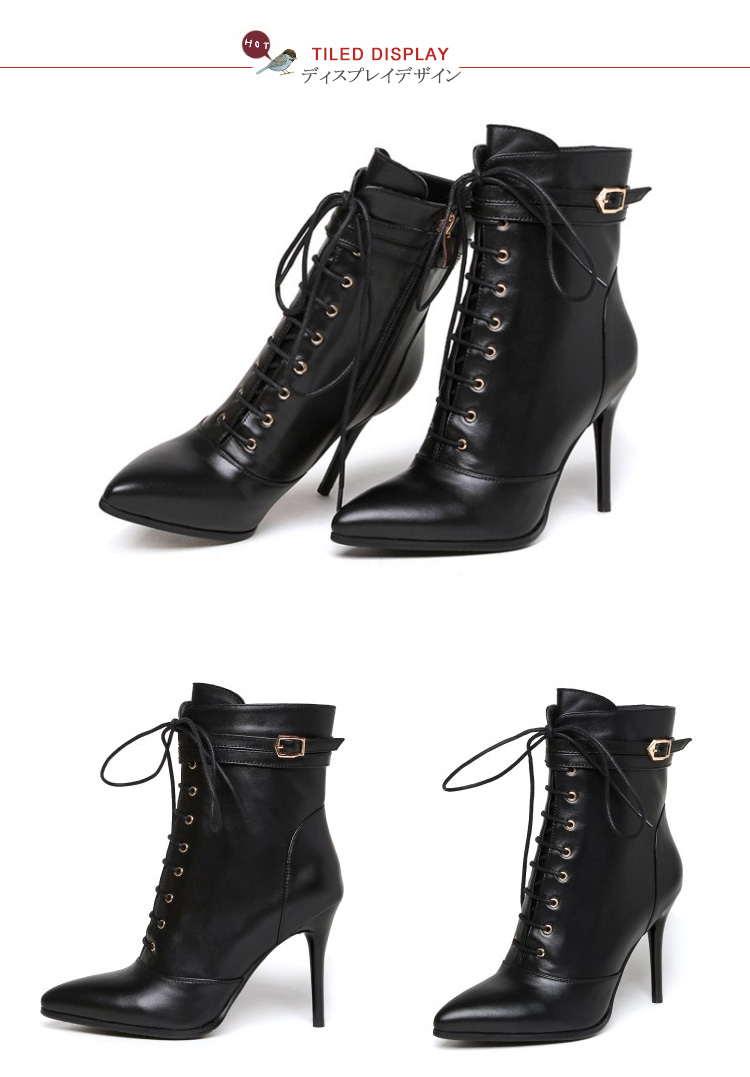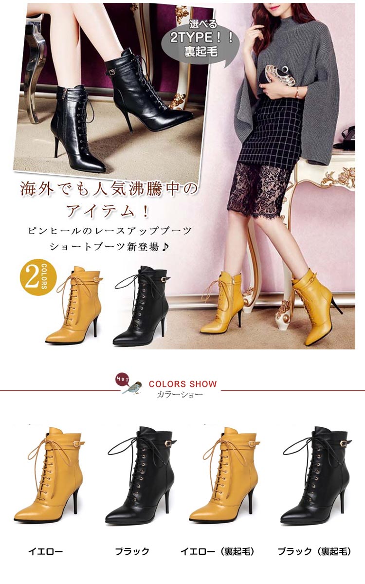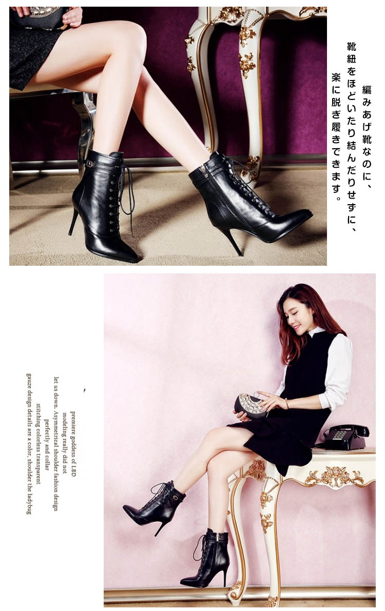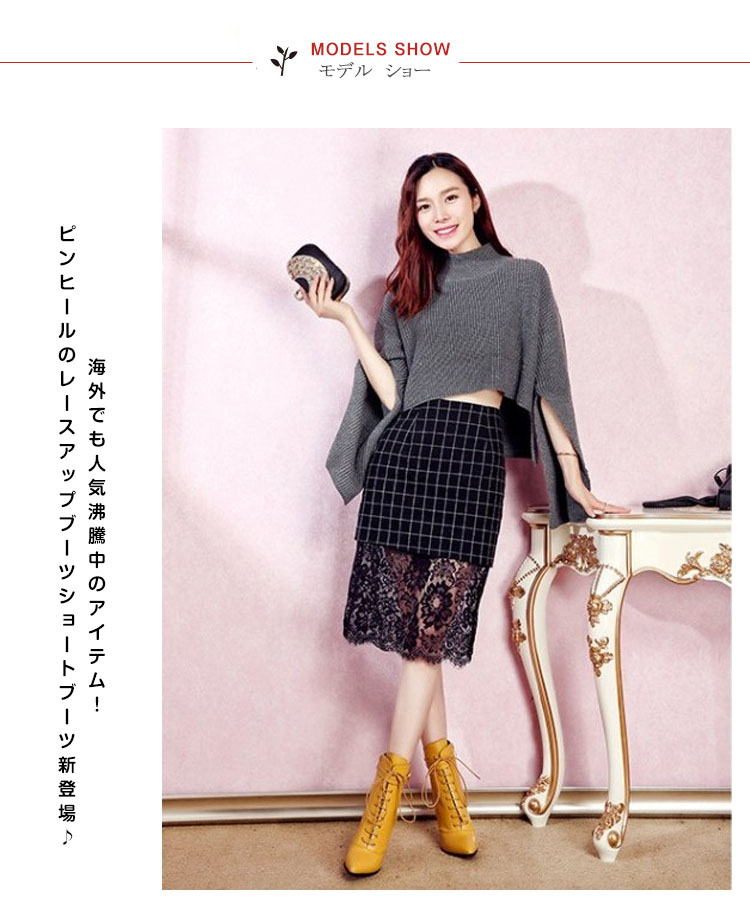 | 海外でも人気沸騰中のアイテム!ピンヒールのレースアップブーツショートブーツ新登場♪編みあげ靴なのに、靴紐をほどいたり結んだりせずに、楽に脱ぎ履きできます。 | |