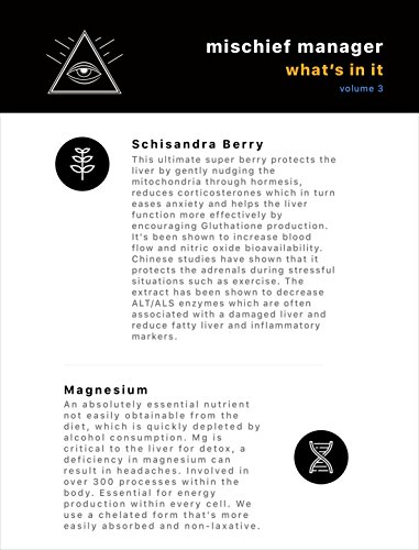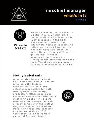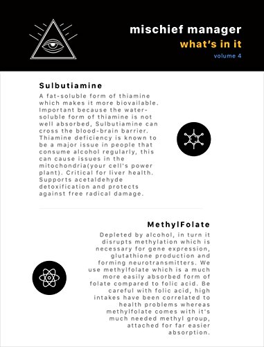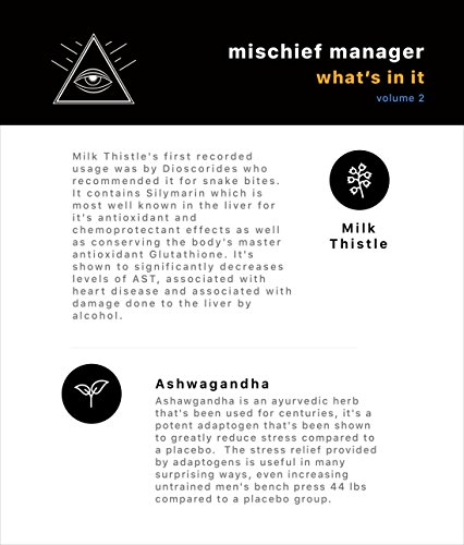 -. Feature : ✔ Nausea Relief: Our encapsulations are filled with Ginger, Vitamin C, and Milk Thistle Extract and our antioxidants elixir will help calm your stomach and neutralize the acetaldehyde toxin, making you feel instantly better.* / ✔ Lift your Mood and Energy Levels: A powerful Nootropic Stack and Adaptogenic Herbs will help kick off your hangover recovery and bring you back to a place where you can feel better, and function at a high level with additional Adrenal fatigue support. These powerful botanicals and nutrients were specifically chosen to help you bounce back and focus on the things that matter. They'll help stimulate dopamine and provide stress-relief from the toxic effects of alcohol. Caffeine Free.* / ✔ A Potent Multivitamin Formula: Perfect add-on for your hangover kit. Party Smart and Drink Smart. Our first line in your hangover defense. Enjoy your nightlife again and find some relief! The base of Mischief Manager is a potent multivitamin containing a special B-Complex, Sulbutiamine, D3 & K2(mk-7) and Sodium Ascorbate that will refill you with nutrients you've lost during your night and help boost your glutathione status naturally and help you get back to your daily routine effectively.* / ✔ Headaches: The hangover relief you need. We've added anti-inflammatory herbs such as Ashwagandha Extract, Ginseng Extract, Schisandra Berries and a chelated form of Magnesium to help ease impact of headaches, if not completely stop them in their tracks. These headaches are being caused by depletion of essential nutrients due to alcohol being a diuretic and inflammation to the body caused by acetaldehyde. Tylenol and Ibuprofen are just going to add insult to injury on an already damaged liver.* / ✔ Advanced Liver Detoxification: Best holistic liver support cleanse for a serious drinker - Milk Thistle(30:1), Sodium Ascorbate, Sulbutiamine( B1) and the Mg Chelate will all work together in overtime to help clear your body of toxins.* ✔METHYLATION SUPPORT: MethylFolate and Methyl b12 will help your DNA repair, regenerate itself and function again.* ✔ A Hangover Cure you count on: Just shoot us a message if you're dissatisfied for ANY reason and we'll refund you, no questions asked.