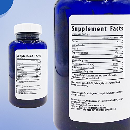 -. Title : Omega 3 Fish Oil Supplement. 1500 Mg, Pharmaceutical Grade. Triple Strength, No Metals. Burpless, Lemon Flavored, No Fishy Aftertaste. Product of Canada. 800 EPA and 600 DHA Per Serving. 60 Count.