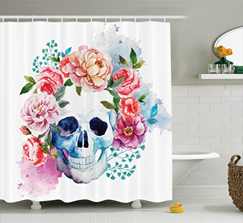 Skulls Decorations Shower Curtain Set By Ambesonne, Funny Skull With Colorful Floral Head Victorian Style Dead Skeleton Graphic Art Print, Bathroom Accessories, 75 Inches Long, Multi
