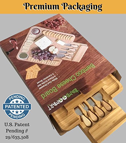♻ BETTER & SAFER FOOD PRESENTATION: Naturally antimicrobial and antibacterial, our handmade bamboo wood cheese boards and knife set has conveniently edged kit for presenting crackers and breads. Elegant grain finish and warm bambu color make it simply amazing. We happy to offer LIFETIME WARRANTY If You Do Not Love This Product For Any Reason We Will Refund You Your Entire Purchase. Also Be Sure to Pick up Our Large Slate Cheese Cutting Board set with knives set.U.S.Patent Pending #29/633,508