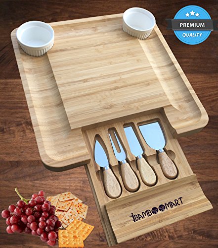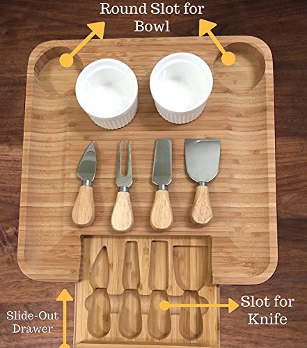 ♻ ORGANIC BAMBOO Cheese Board Includes SlideOut Drawer with Various Slicing, Spreading & Serving Knives set, it elegantly designed two round slot, which keeps the bowl securely in place. TWO WHITE 1.85"H CERAMIC BOWL additionally gives extra features to serve sauces, nuts, olives and condiments. it has drip premium grooves that hold crackers, breads, dried meats and chips.