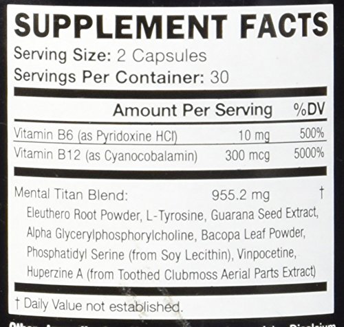 MENTAL TITAN BLEND + B12 + B6 CREATES ULTIMATE COGNITIVE ENHANCING FORMULA: that supports increased focus, concentration, reaction time, memory recall, mental cognition with all day mental clarity & energy, without using large amounts of stimulants.