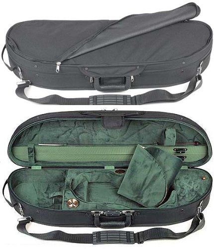 -. Feature : Black exterior with green velour interior with suspension / A beautifully designed and economical case / Hygrometer, humistat, two bow holders, velcro neck restraint, blanket and accessory pocket / Screw attached canvas cover with music pocket, D-rings, subway strap and shoulder strap / 4/4 violin size