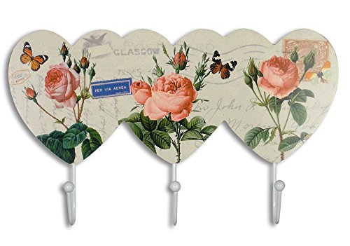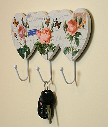 Decorative Wall Hooks - Pink Rose Wall Key Holder with Butterflies Flowers - Vintage European Post Card Letter Pattern - 3 White Metal Hooks - 11.5 Inch Wide