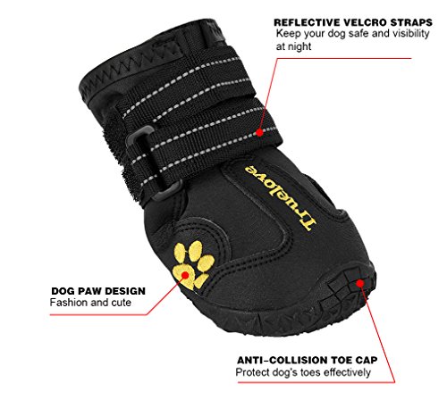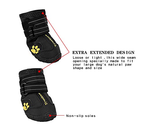 -. Binding : Misc. -. Brand : EXPAWLORER -. Color : Black -. Feature : 5 sizes for you choose. / Reflective material and velcro straps provides visibility and safety at night, waterproof material keeps your dogs paws dry in rain or snow / Easy to put on and take off as the shoe expands to put on and the two velcro straps ensure a tight fit. / Flexible lug design and grooved soles gives your dog better control and protect paws from the cold weather. / The size is the size inside the boots, not boots size outside; Choose size according to width is better -. Label : HAOBO -. Manufacturer : HAOBO -. Model : ES001 -. PackageQuantity : 1 -. ProductGroup : Pet Products -. ProductTypeName : PET_SUPPLIES -. Publisher : HAOBO -. Studio : HAOBO -. Title : EXPAWLORER Waterproof Dog Boots Reflective Non Slip Pet Booties for Medium Large Dogs Black 4 Pcs