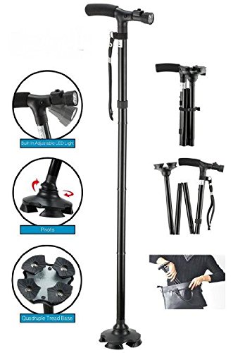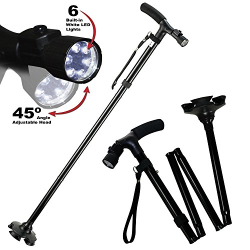 ★ EASY & PRACTICAL FOR EVERYDAY USE Provides maximum safety and endurance while remaining lightweight. Ergonomically-designed grip handle together provide the user with maximum safety and comfort while exhibiting high quality and sustainability. Soft foam grip handle with pivoting head light with 6 built-in white LED lights to light up the way. Folding cane Stands up on its own