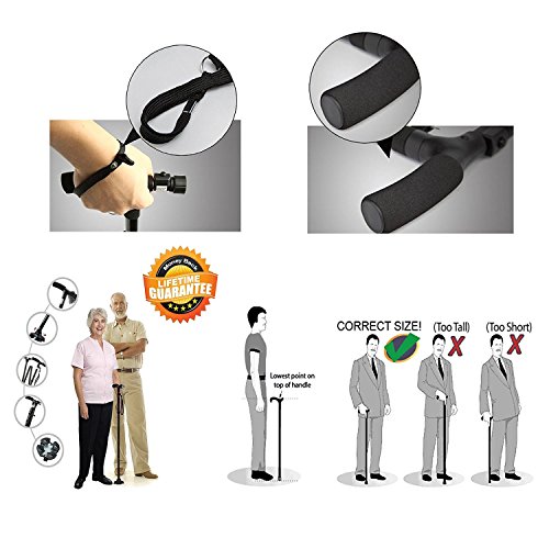 ★ GREAT FOR USE ON THE GO On the go solutions. Folds easily for storage or travel and has a convenient wrist strap. Unisex item for the elderly men or women and fits inside of luggage, backpacks, trunks etc. Comfortable foam grip handle for those who suffer from arthritis. Care should be taken when using the walking stick on wet floors, tiles and other slippery surfaces. Extra wide Quad base for self-balancing and extra sturdiness 4 safety grips