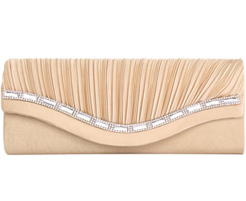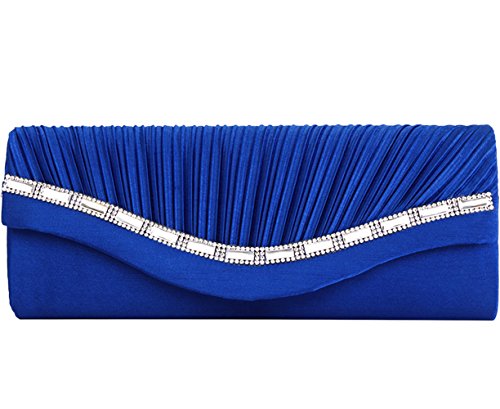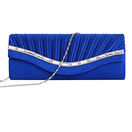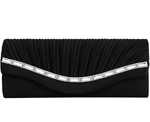 The Fashion Clutch features front pleated and crystal embellishment with magnet snap closure, and 1 removeable silver chain.