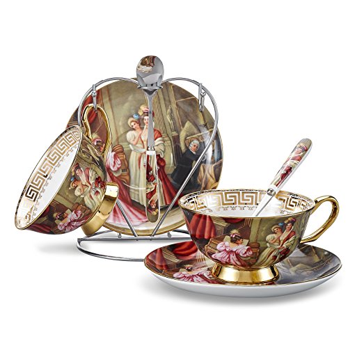 Material: Bone China Pattern: Figure Color: Multi-color Cup volume: 6.8oz/200ml Cup size: 13*10*7.2*cm Saucer size: 15*15*2cm Spoon size: 14.5*2.4*0.8cm Packing size: 27.5*19.5*19.5cm Packing weight: 0.95kg Package Content 2 * 5" Cup 2 * 6" Saucer 2 * 5.75" Spoon 1 * Iron Stand Feature: It's conform to the Bone China national standard, environmentally friendly Thin but elegant, smooth surface makes it different from ordinary porcelain Exquisite material, if you slightly tap it, you can get very crisp sound. Note: Size manual measurement, the slightest error, for reference only. If received damage or not satisfied, please feel free to contact us. Slight flaw may exist in single product as they are handicraft products. Suitable for dishwasher cleaning, But can NOT be putted a microwave oven. 0 |