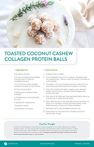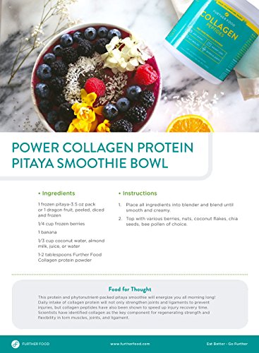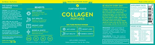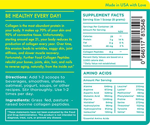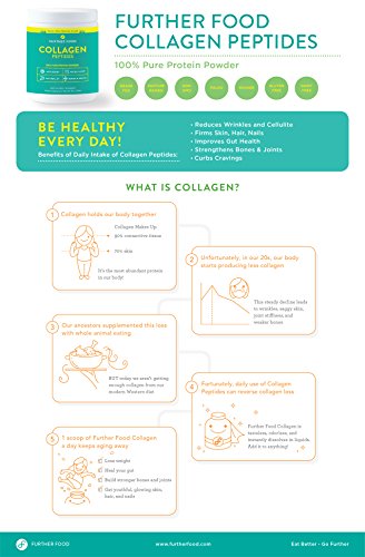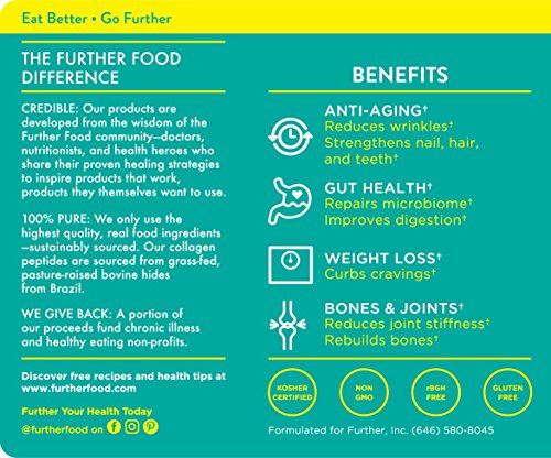 BE HEALTHY EVERY DAY with Further Food Collagen Peptides, the ultimate anti-aging protein powder. Daily use promotes weight loss while reversing wrinkles, strengthening hair and nails, improving gut health, and reducing joint stiffness! Our hydrolyzed collagen protein powder quickly dissolves (no flavor, smell or gelling) and can be added to your favorite beverages or meals. Just scoop, mix, and go further!