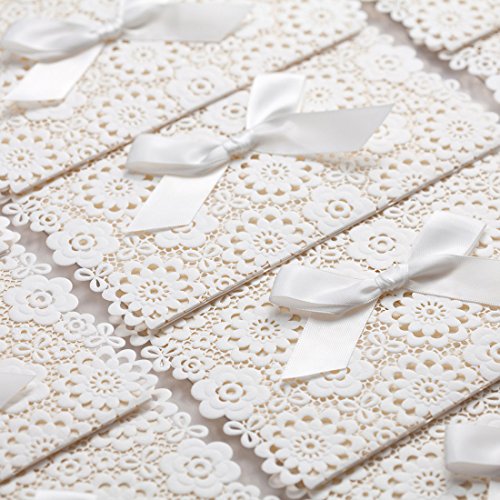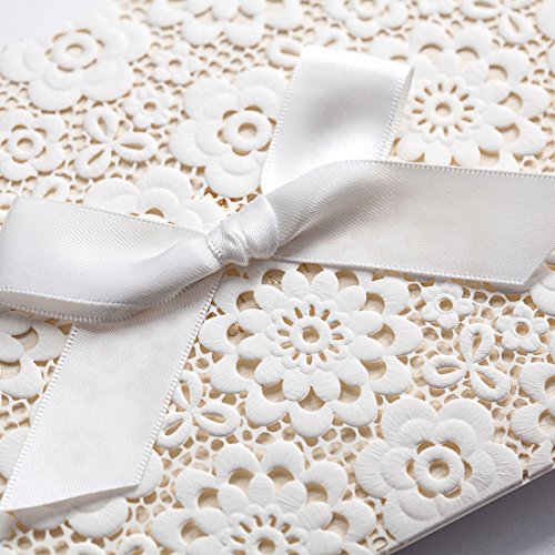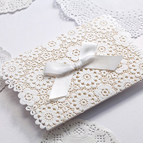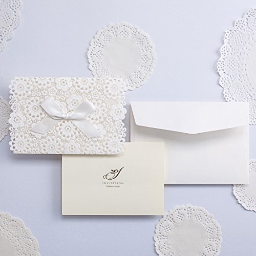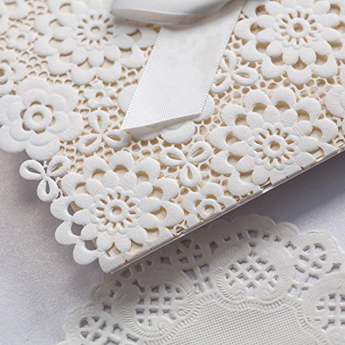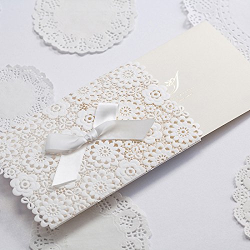 - White INVITATION COVERS is 4.8 x 7.5 inch, which is made of thick card paper and laser cutting technology. It has a white bow on its front