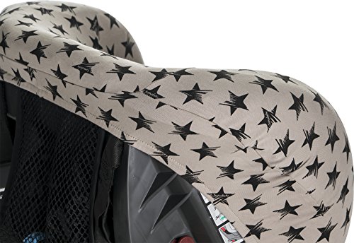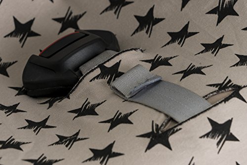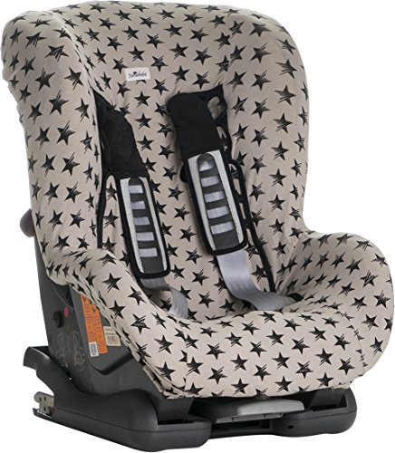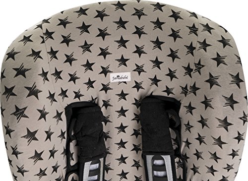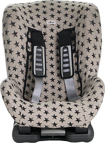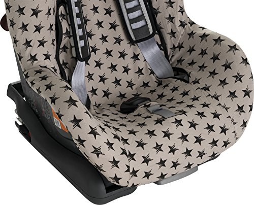 Beige fabric with black chalky stars pattern. Fits infant carriers / car seats (BRITAX,CHICCO,SAFETY, MICO,ETC)+ for example: Maxi Cosi, Romer, Cibex, Jané, Peg Perego, Chicco, etc. Fits over the existing synthetic cover of the chair.