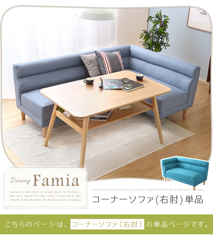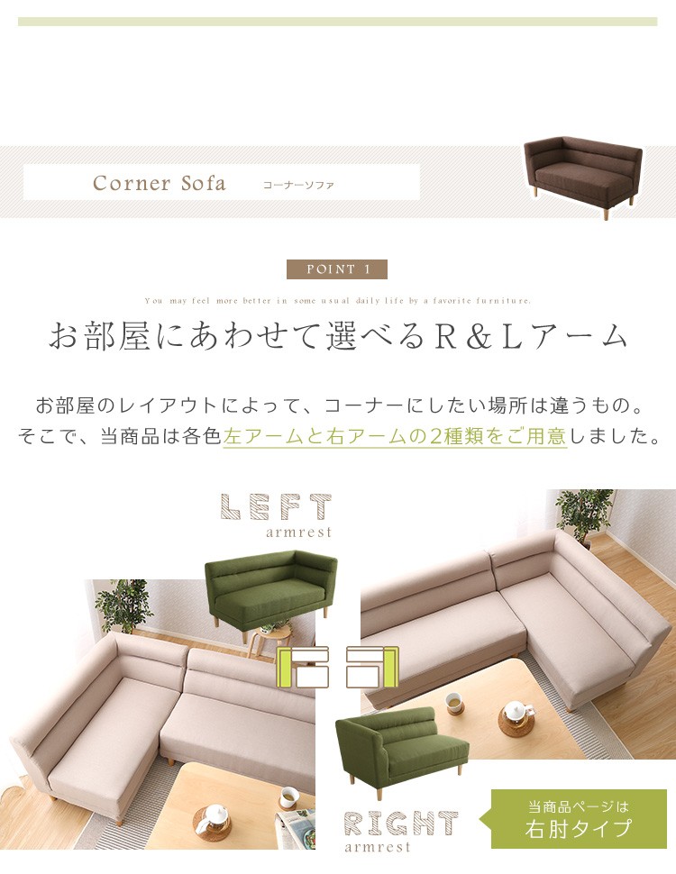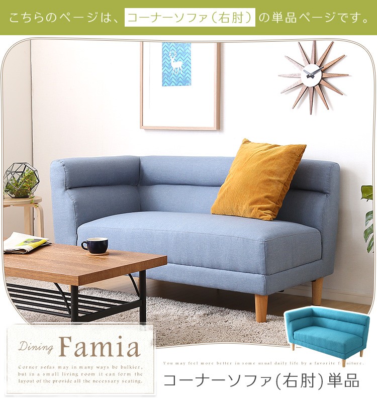 【商品について】コーナーソファ(カウチソファ)右アーム単品 天然木脚を外せばローソファにも|Famia-ファミア-■サイズ:外寸:(約)幅130x奥行70x高さ70cm※商品重量:(約)21kg■カラー:イエロー、グリーン、ブラウン、ベージュ、ライトブルー、ターコイズブルー■素材:構造部材:木枠 張り材:ポリエステル100%クッション材:ピュアウレタン脚部:天然木■その他:・お客様組立商品です・梱包サイズ:(約)幅132x奥行72x高さ56cm・梱包重量:(約)23kg