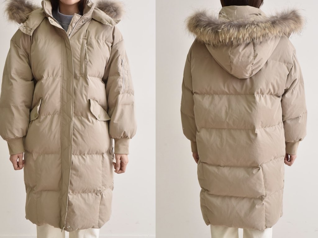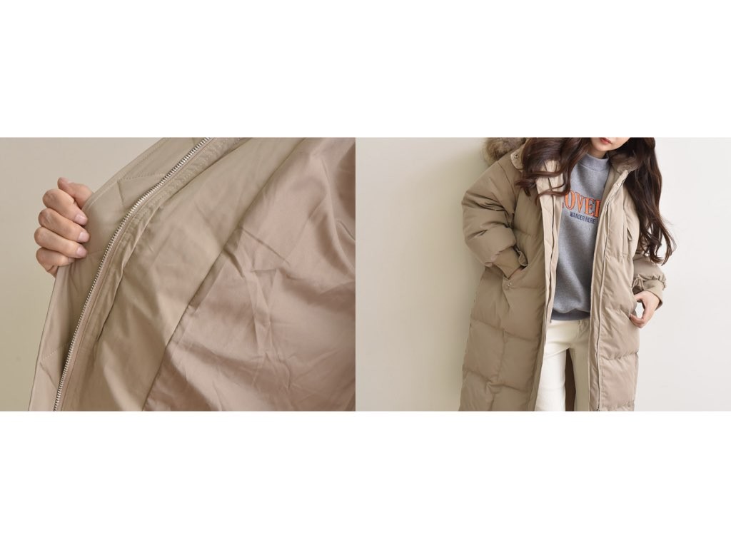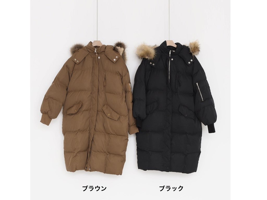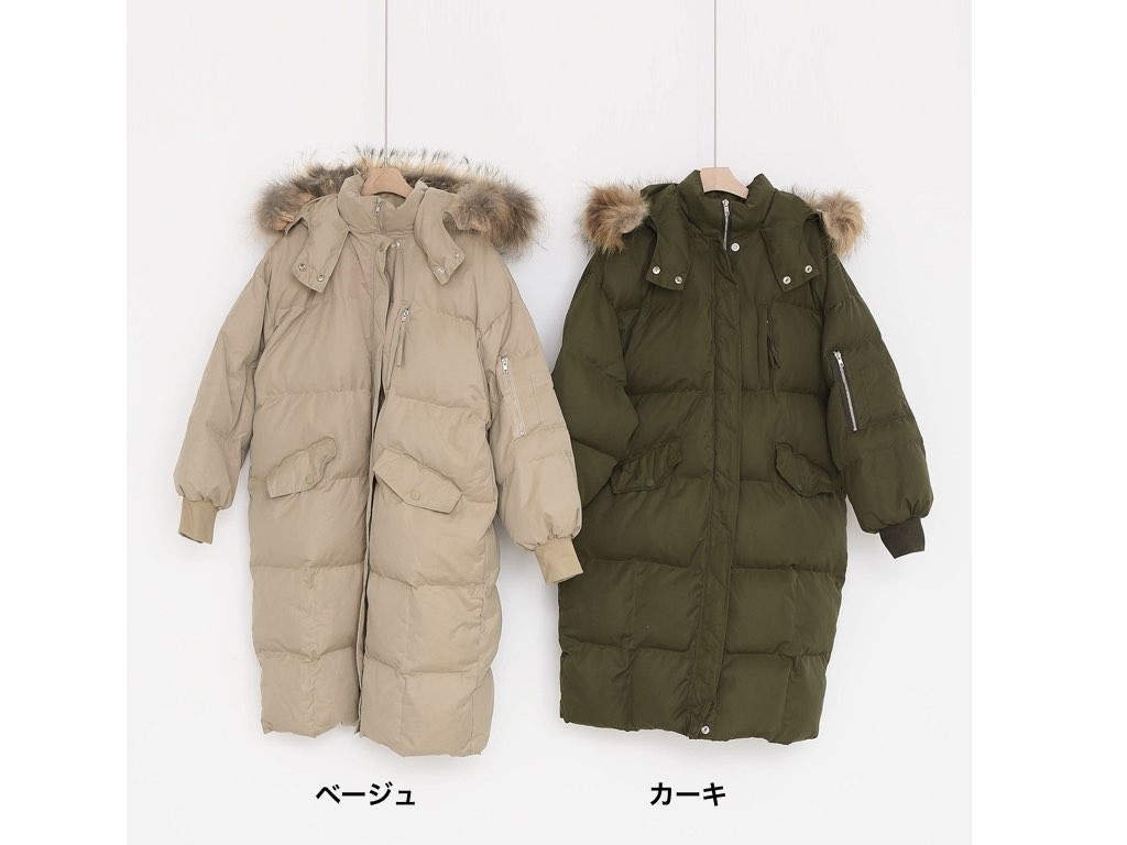 ロングのダウンコートです。さらりと着流せる長め丈です。休日スタイルなどに最適なコートです。とても防寒性があり、これからの季節にオススメです。商品は、とても丁寧なつくりとなっています。1.基本情報色:4色展開(ベージュ/カーキ/ブラウン/ブラック)サイズ:Free素材:ポリエステル製造国:Korea2.サイズ情報肩幅:57cm身幅(胸断面):59cm 腕の長さ:52cm 着丈(前):106cm (サイズは計る方法に応じて±2〜3cmの誤差があります。ご了承お願い致します)モデル着用サイズ:F※着用モデル(163cm、体重47kg、足のサイズ24.5cm)3.その他の情報厚み:厚い透け感:なし伸縮性:なし裏地:あり洗濯方法:ドライ(クリーニング)[注意事項]お取り寄せ商品は、海外より仕入れるため納品まで約10日前後いただきます。また店舗でも販売しており、在庫切れになる場合もございます。ご了承お願い致します。