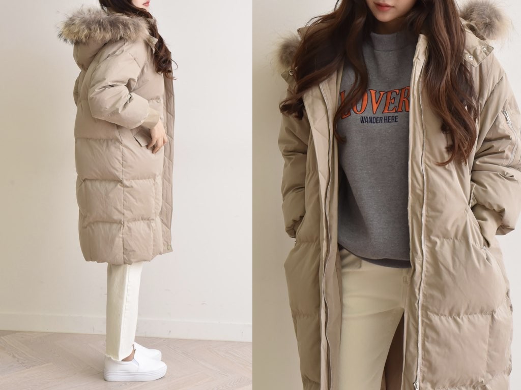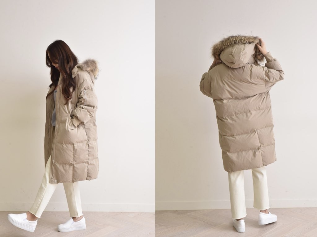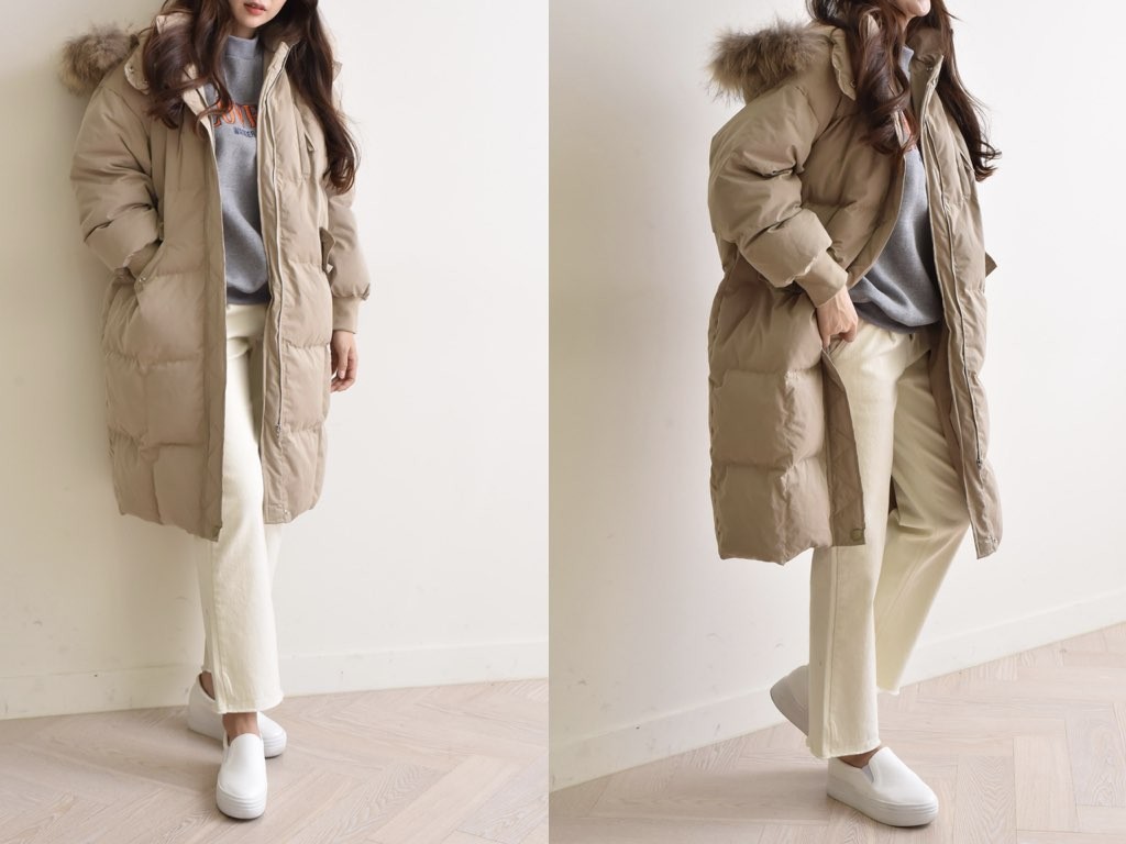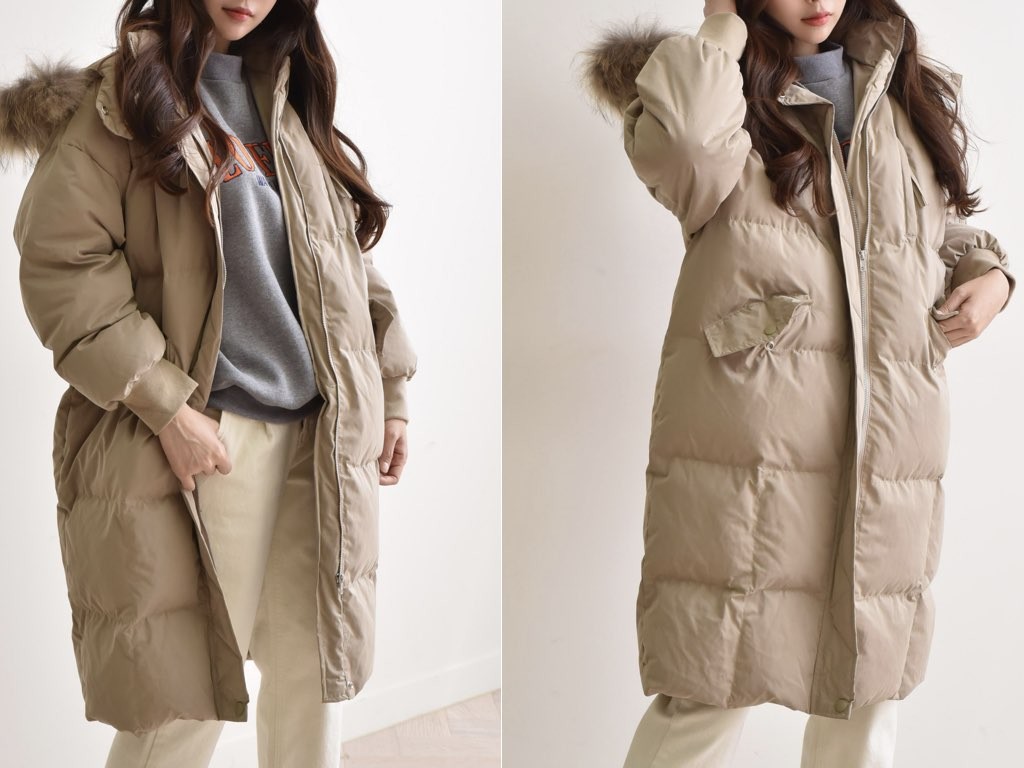 ロングのダウンコートです。さらりと着流せる長め丈です。休日スタイルなどに最適なコートです。とても防寒性があり、これからの季節にオススメです。商品は、とても丁寧なつくりとなっています。1.基本情報色:4色展開(ベージュ/カーキ/ブラウン/ブラック)サイズ:Free素材:ポリエステル製造国:Korea2.サイズ情報肩幅:57cm身幅(胸断面):59cm 腕の長さ:52cm 着丈(前):106cm (サイズは計る方法に応じて±2〜3cmの誤差があります。ご了承お願い致します)モデル着用サイズ:F※着用モデル(163cm、体重47kg、足のサイズ24.5cm)3.その他の情報厚み:厚い透け感:なし伸縮性:なし裏地:あり洗濯方法:ドライ(クリーニング)[注意事項]お取り寄せ商品は、海外より仕入れるため納品まで約10日前後いただきます。また店舗でも販売しており、在庫切れになる場合もございます。ご了承お願い致します。