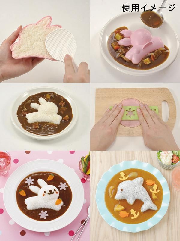 | うさぎ、いるか、はなの型はご飯を詰めてカレーをかわいくアレンジできます。抜き型もセットになっているので、ほかの道具を使用しなくても飾り付けができます。 |
