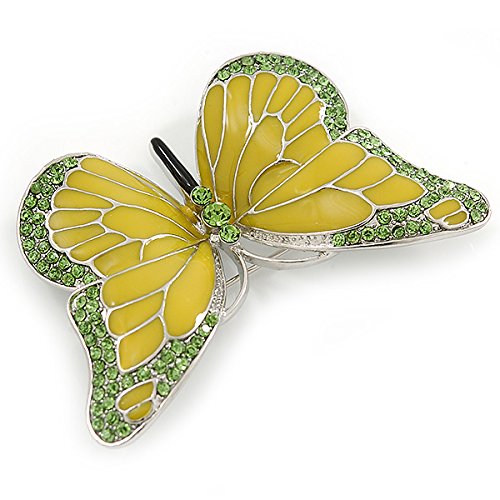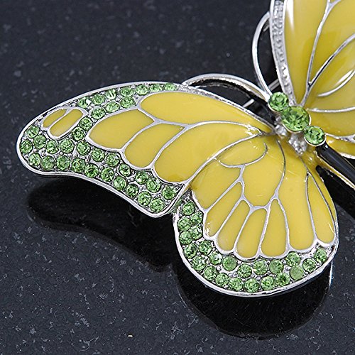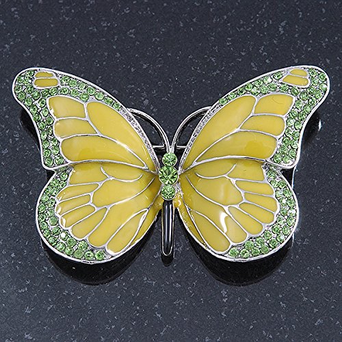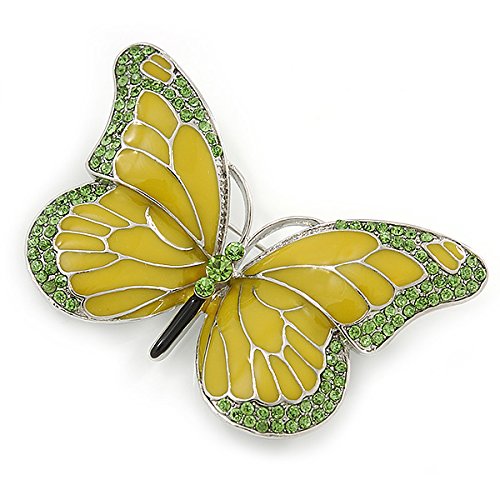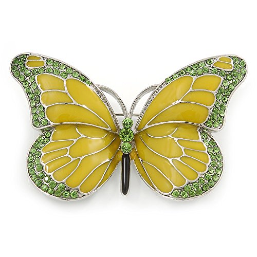 -. Title : Olive/ Light Green Enamel, Crystal Butterfly Brooch In Rhodium Plating - 65mm Across
