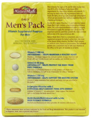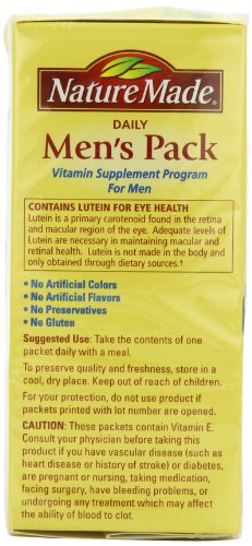 -. Binding : Health and Beauty -. Brand : Nature Made -. Feature : No artificial colors. / No artificial flavors. / No preservatives. -. Label : Nature Made -. Manufacturer : Nature Made -. MPN : 1025 -. PartNumber : 1025 -. ProductGroup : Health and Beauty -. ProductTypeName : HEALTH_PERSONAL_CARE -. Publisher : Nature Made -. Studio : Nature Made -. Title : Nature Made Men's Pack Vitamin, 30-Count