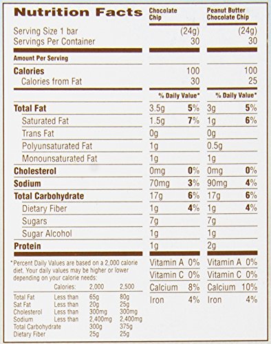 -. Feature : 30 chocolate chip; 30 peanut butter chocolate chip / Real chocolate chips. / 8 g whole grains. Est 1877. Chocolate Chip (per Bar): 100 calories. Peanut Butter Chocolate Chip (per Bar): 100 calories.
