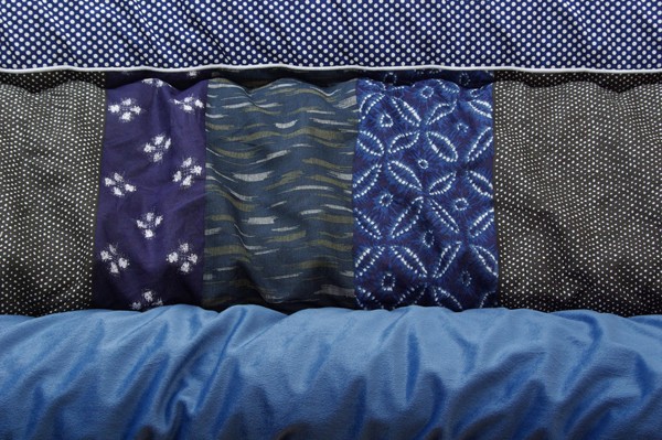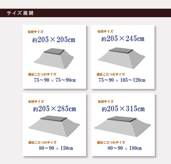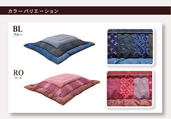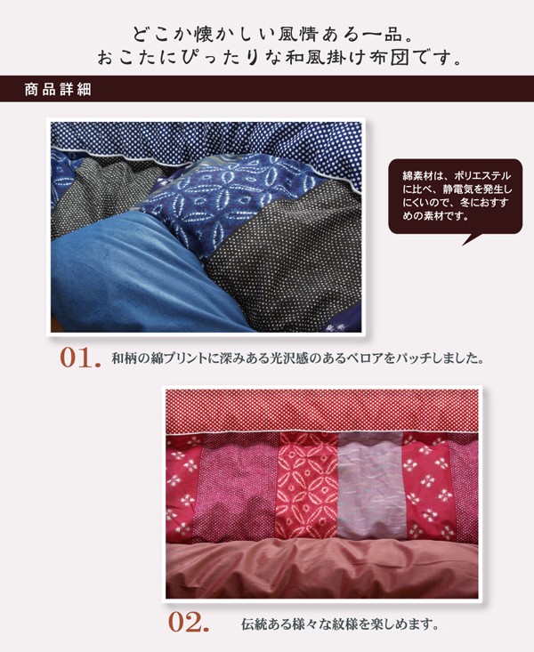 和柄のこたつ布団です。表地の柄部分には綿素材を使用しています。綿はポリエステルに比べ静電気が起きにくく、繊維の中でも特に肌触りがよいのが特徴です。無地部分には肌触りがよく、深みのある光沢が特徴のベロアを使用しています。こちらの商品は国内でわた入れをしています。部分暖房のこたつは電気代もおトクです。