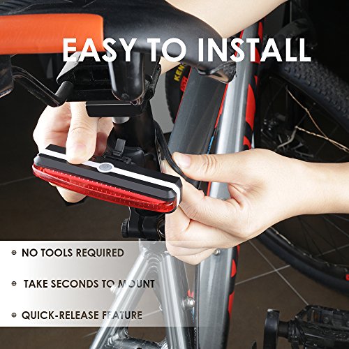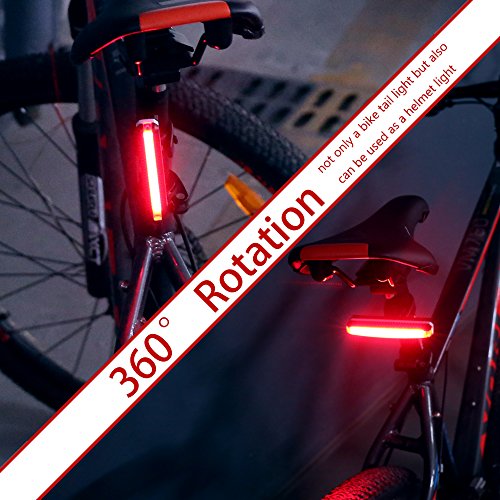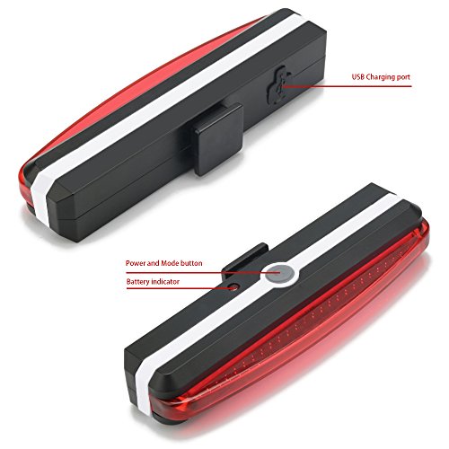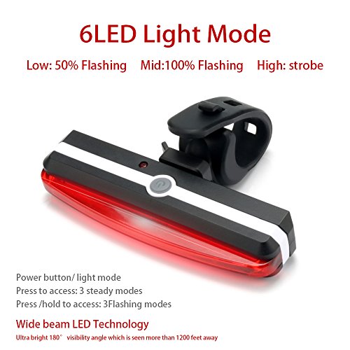 -. Feature : 100 lumens LED bike tail light with a 180-degree visibility angle makes you super easy to spot. Incredibly visible rear bike light. NOT ONLY at night but also at daytime / 6 Different Modes: 3 Steady (Low - up to 7 hrs, Medium - up to 3 hrs, High - up to 2 hrs), 2 Flash (50 % - up to 5.5 hrs, 100 % - up to 3 hrs) and 1 Strobe (up to 2.5 hrs). Water resistant according to IPX4. / USB RECHARGEABLE TO SAVE YOUR MONEY AND HASSLE NEVER waste money on batteries again! Takes 2 hours to fully charge and has a runtime of 2+ hours on the brightest setting. / Easy to Install - Use the rubber band to fix the tail bike light in anywhere you want to install. Such as handlebar, the back of a helmet, the seat post and anyother place you can install. / 100% Satisfaction Guarantee - If you are not satisfied with the bike tail light for any reason within 30 days of purchase, let us know and you get your money back.