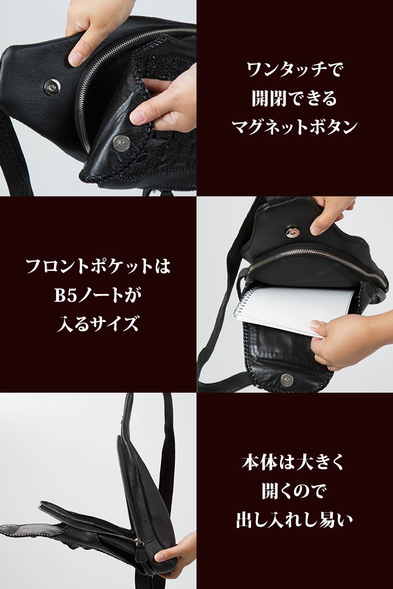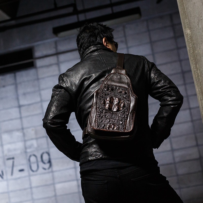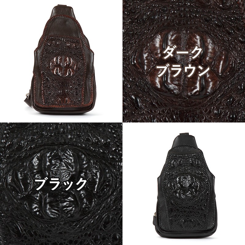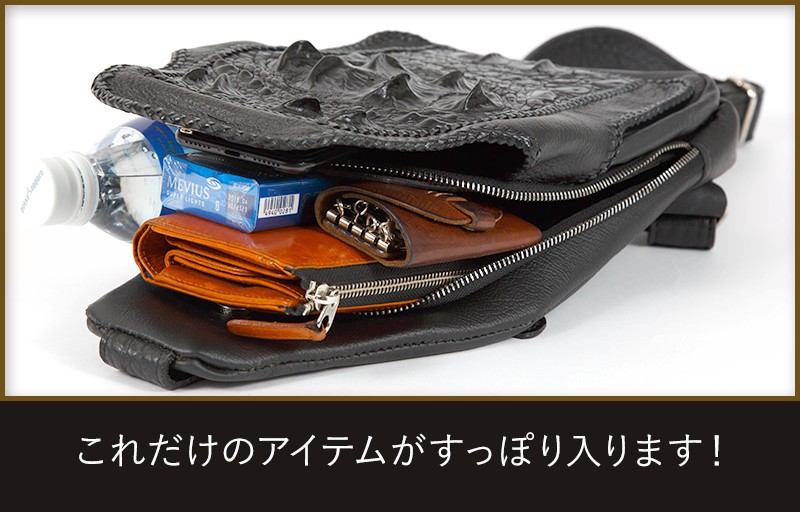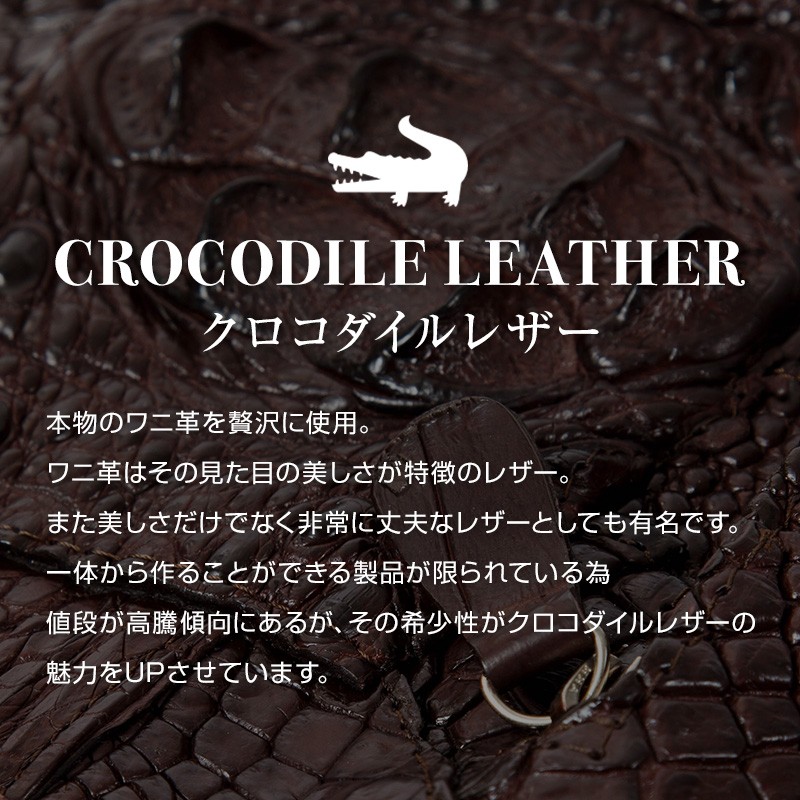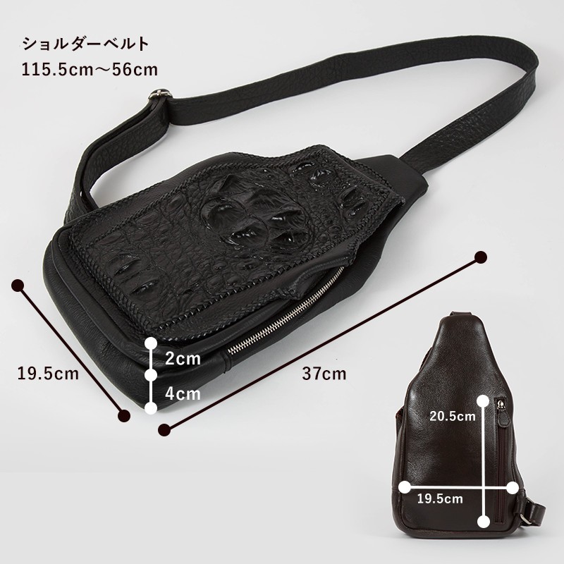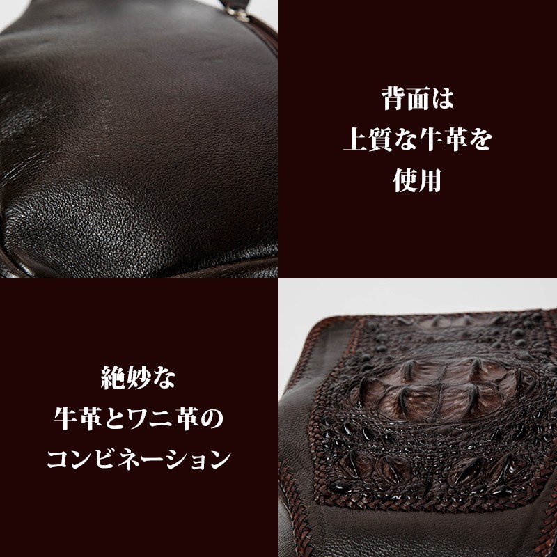 【素材】 牛革/ワニ革 内側:ナイロン(裏地) 【サイズ】本体外寸 高さ:約37cm 幅:約19.5cm マチ:約2cm + 4cmベルト長さ 115.5cm~56cmフロントポケット 深さ:15.5cm 幅:19.5cm【カラー】ブラウン・ブラック【仕様】ポケット×1 (内部×1) 上質の牛革とクロコダイル(ワニ革)を使用して革職人がハンドメイドで仕上げたレザーボディバッグ。財布等普段持ち歩く小物も、ペットボトルまでスッポリ収納可能。使い込むほどに渋味が出て末長く愛用出来ます。Deep Zone ワイルドでセクシーを上品にまとめる男のレザーブランド。自分買いからプレゼントにも人気でオススメです。