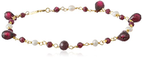 Garnet Teardrops and Rondelles with Linked Freshwater Cultured Pearl Gold Over Silver Bracelet