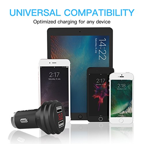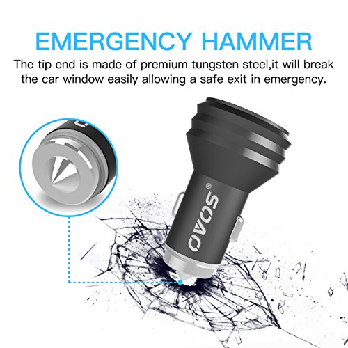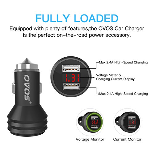 OVOS Car Charger Dual USB Ports Metal Adaptor with Smart Charge Multi-protect Safety System with LED Display and Emergency Hammer (4.8A/24W) for iPhone, iPad, Galaxy and More (Black)