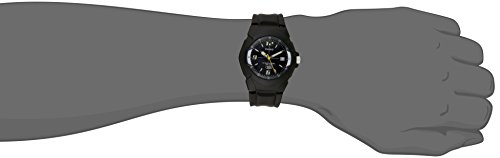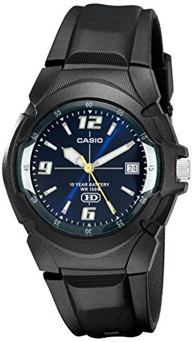 • Black resin watch with navy blue sunray dial featuring luminous hands, 10-year battery, textured crown, and date window