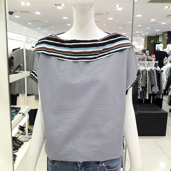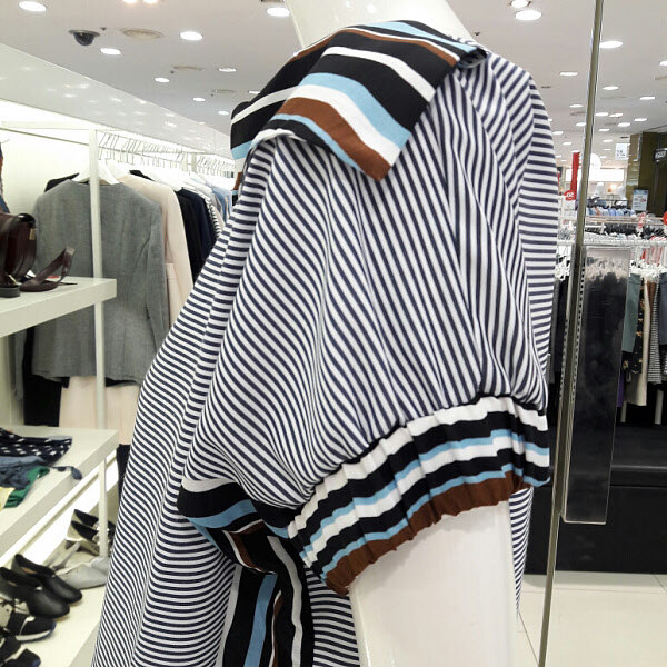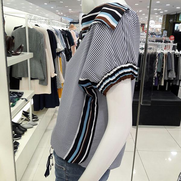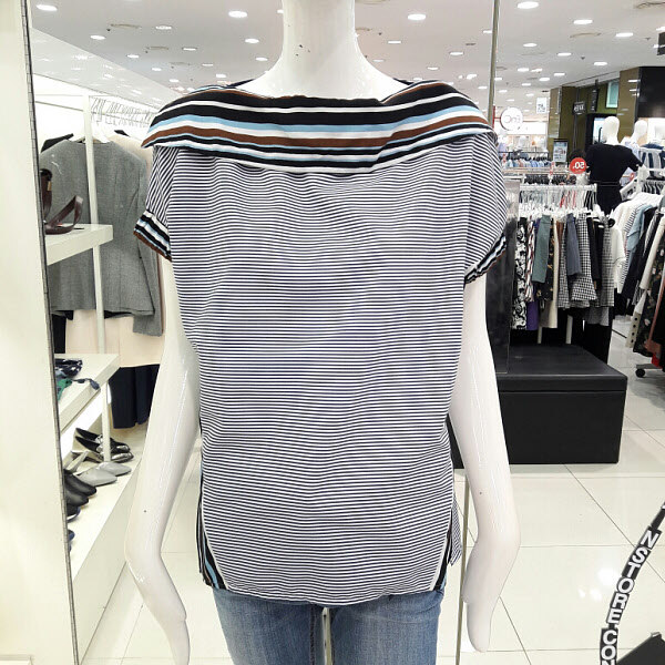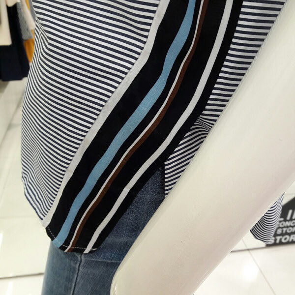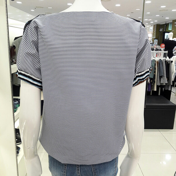 스트라이프배색이 고급스러운 블라우스입니다 넥라인에 포인트가 세련되면서도 여성스럽구요 여름까지 시원하게 착용할수 있으며 와이드팬츠 기본팬츠 청바지에 멋스럽게 코디하기 좋아요