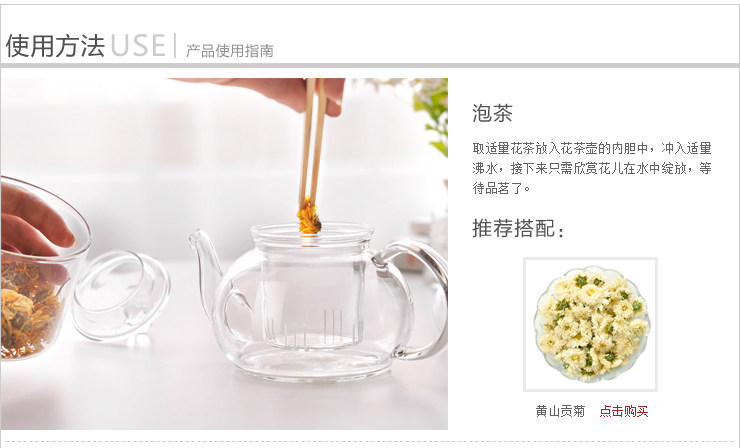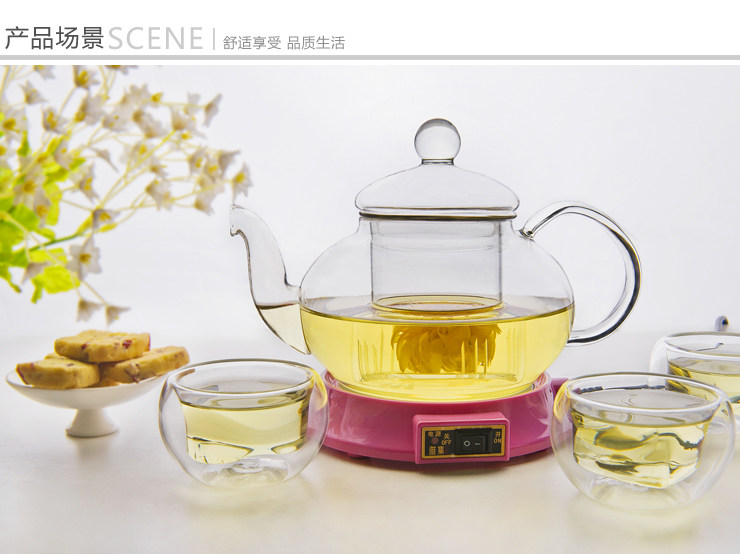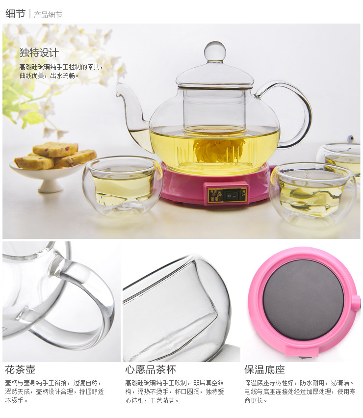 这款玻璃茶具套装非常适合家人朋友相聚时使用,600ml的大容量,多人小聚品茗应付自如,配合心形的品茶杯,精致温馨。一壶花茶,一段美丽的时光。
