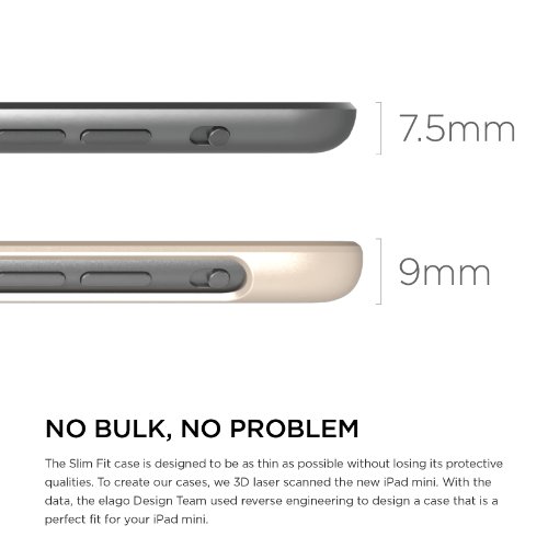 NO BULK, NO PROBLEM : The Slim Fit case is designed to be as thin as possible without losing its protective qualities. To create our cases, we 3D laser scanned the new iPad mini. With the data, the elago Design Team used reverse engineering to design a case that is a perfect fit for your iPad mini.