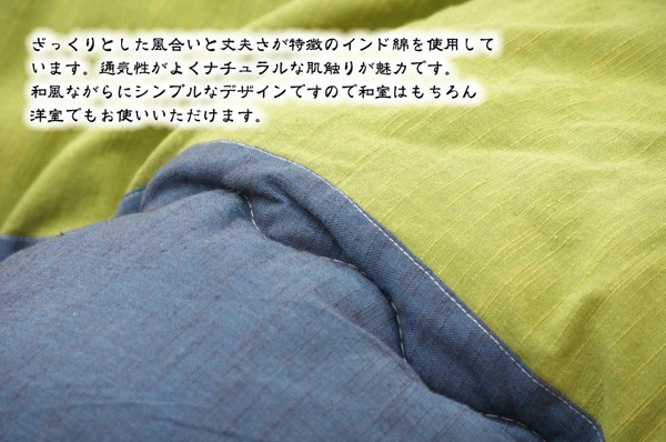 インド産の綿生地を使用しています。インド産の綿は繊維が太く、引っ掛かりや摩擦に強く耐久性に優れています。ざっくりとした生地で通気性が良く、気持ちのよい質感が特徴です。部分暖房のコタツは電気代もおトクです。