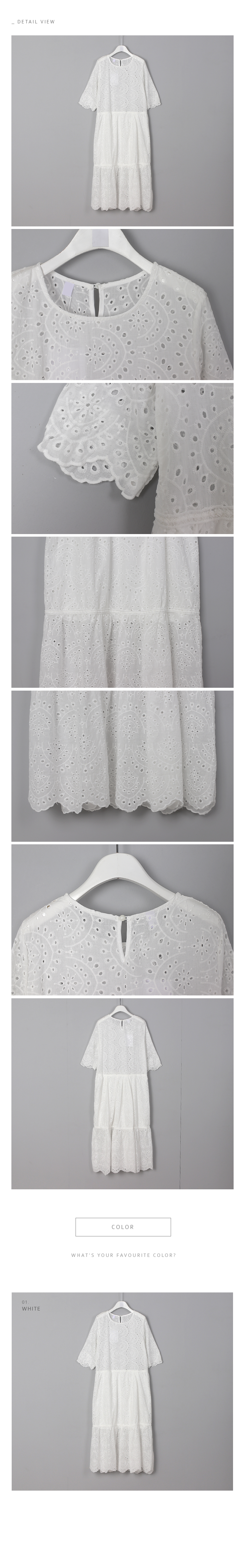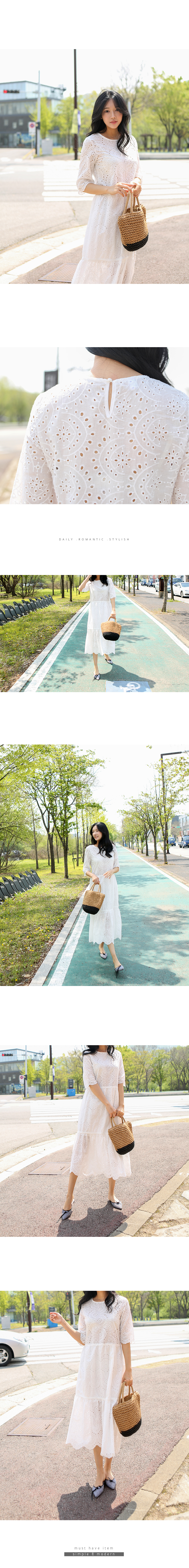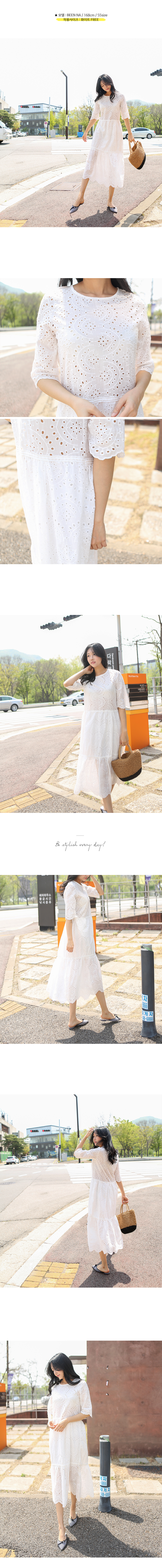 5부길이의 소매와 무릎을 덮는단아한 길이감으로 입자마자시선을 끄는 소녀소녀한감성 가득한 코튼 원피스랍니다허리선부터 무릎윗선까지는안감을 덧대어 비침없이 입을 수 있고상의는 아일렛 디테일이 최대한 살려지도록안감없이 디자인되었기 때문에상의는 스킨톤의 이너를 입어주세요2단으로 플레어지는밑단의 풍성한 폭이 더욱 멋스럽답니다색상은 화이트사이즈는 FREE 44~66