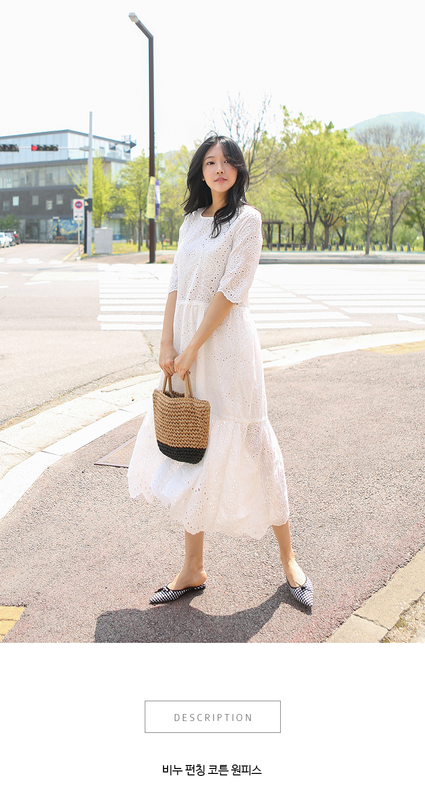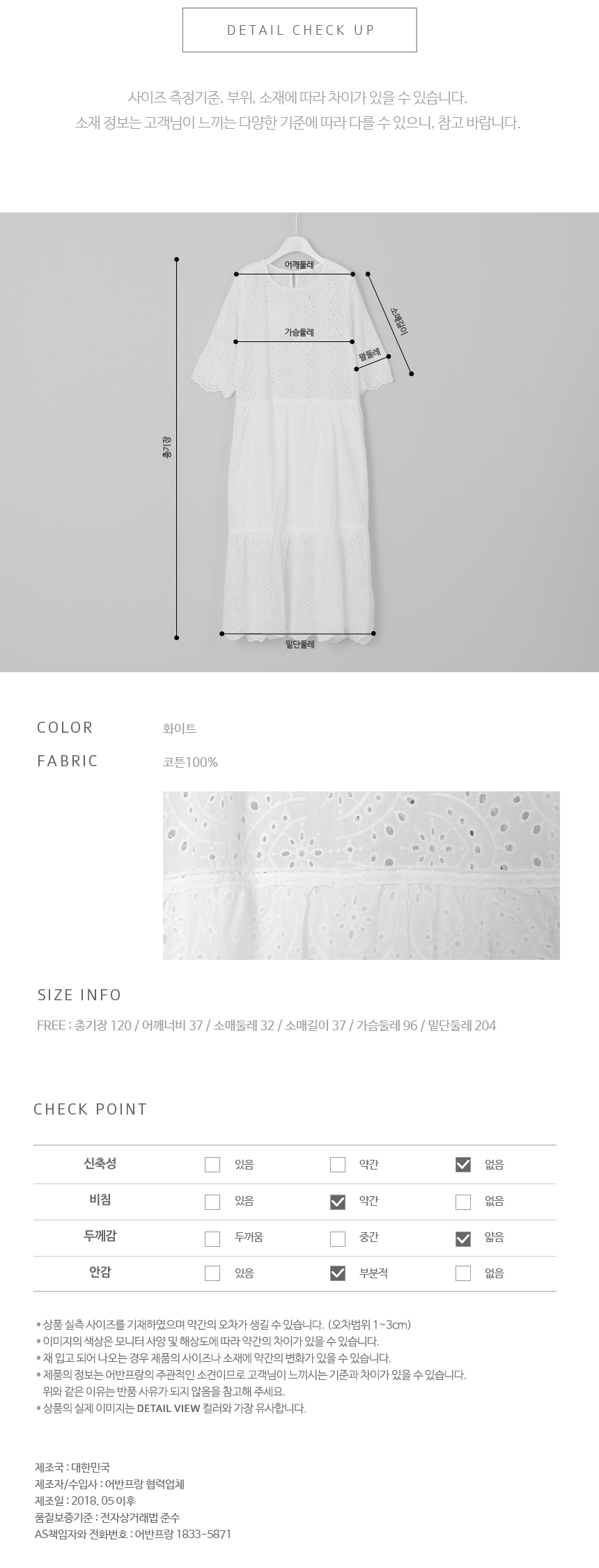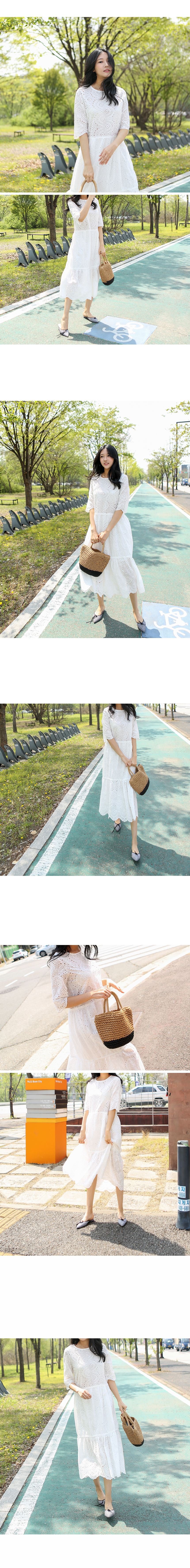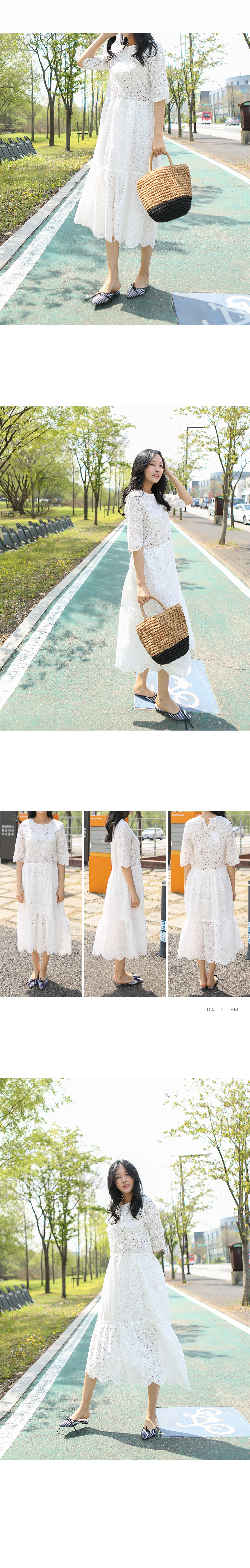 5부길이의 소매와 무릎을 덮는단아한 길이감으로 입자마자시선을 끄는 소녀소녀한감성 가득한 코튼 원피스랍니다허리선부터 무릎윗선까지는안감을 덧대어 비침없이 입을 수 있고상의는 아일렛 디테일이 최대한 살려지도록안감없이 디자인되었기 때문에상의는 스킨톤의 이너를 입어주세요2단으로 플레어지는밑단의 풍성한 폭이 더욱 멋스럽답니다색상은 화이트사이즈는 FREE 44~66