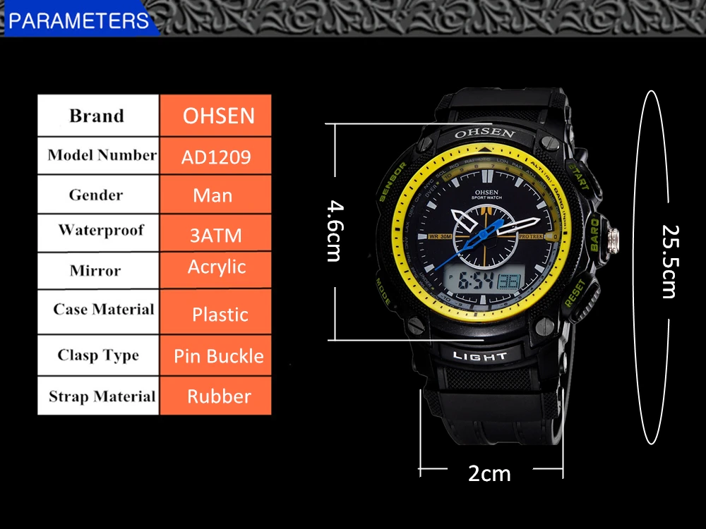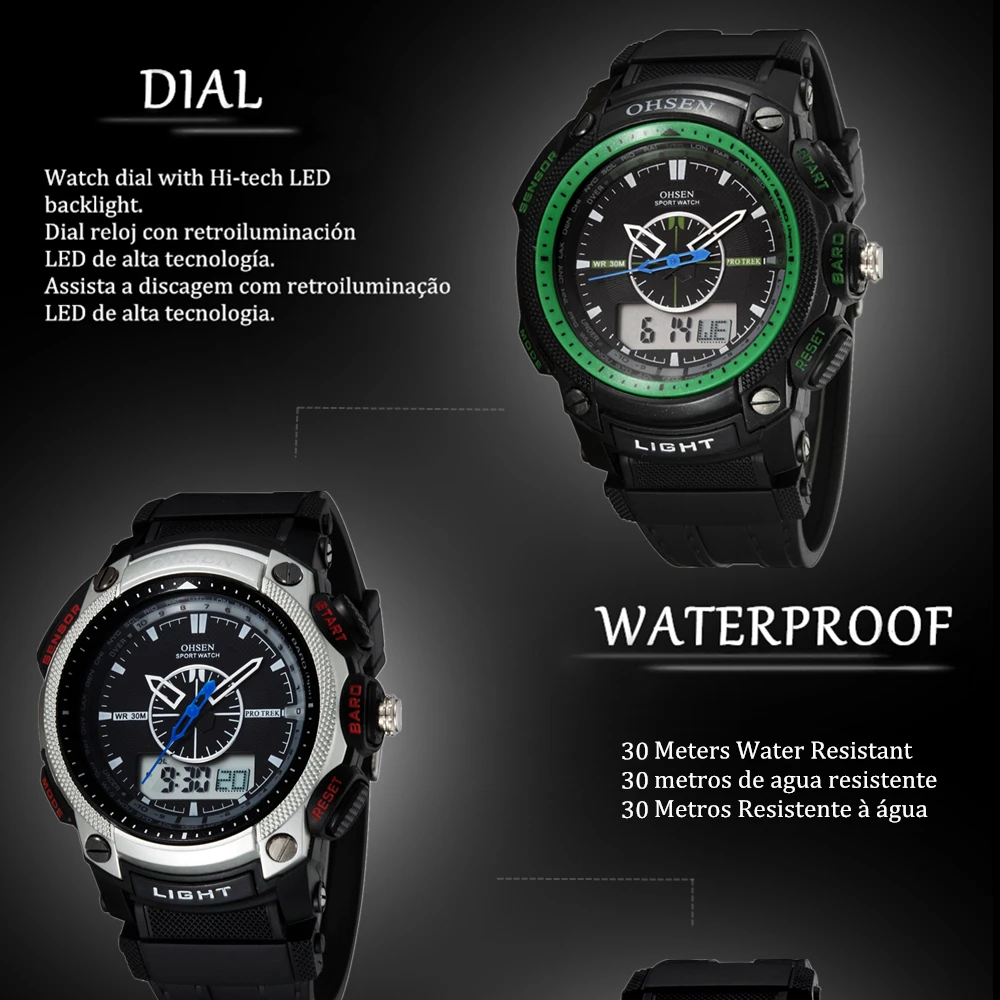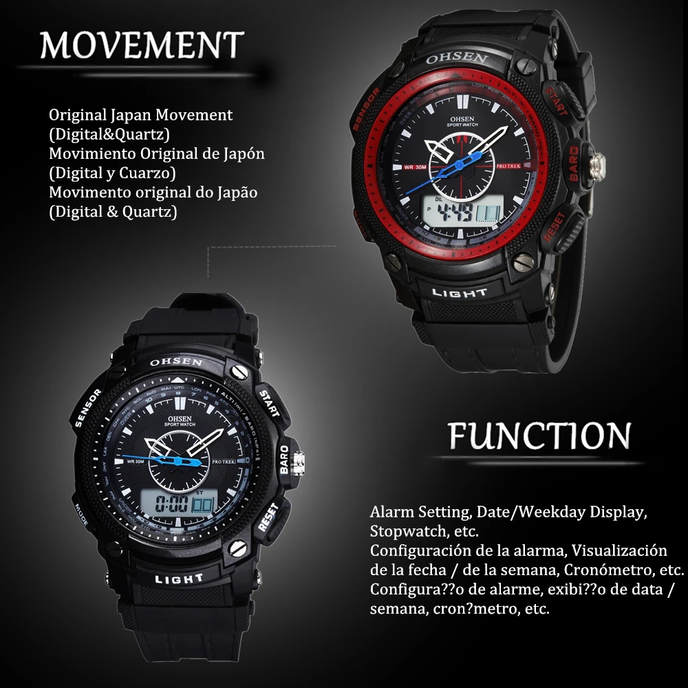 Feature:Alarm,Back Light,Water Resistant,Shock Resistant,Stop Watch,Swim,Multiple Time Zone,Chronograph,LED display