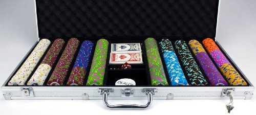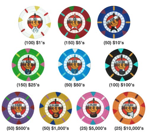 This set includes 100 $1, 150 $5, 50 $10, 150 $25, 50 $50, 100 $100, 50 $500, 50 $1000, 25 $5000, 25 $10,000 chips. Three decks of standard playing cards, five dice and a standard dealer button are also included.