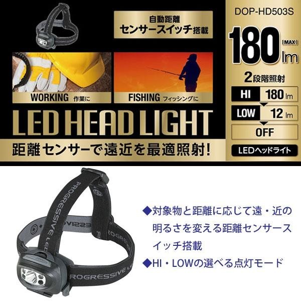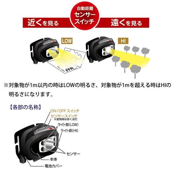 対象物との距離に応じて遠・近の明るさを変える距離センサースイッチを搭載しています。ハンズフリーで手元、足元を明るく照らします。HI、LOWの点灯モードが選べます。 |