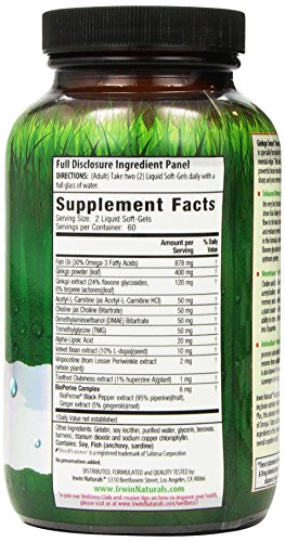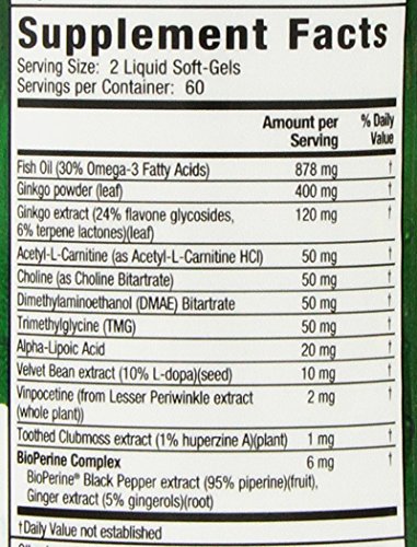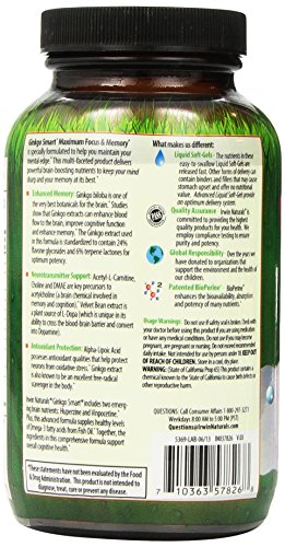 Ginkgo Smart Value Size by Irwin Naturals 120 Softgel Ginkgo Value Size 120 Softgel Ginkgo Smart Maximum Focus Memory is a serious formula to help you keep your mental edge. It provides brain-boosting nutrients to help keep your memory keen and your mind sharp. Directions Take two (2) liquid soft-gels daily with a full glass of water. Supplement Facts Amount Per Serving Daily Value Fish Oil (30 Omega-3 Fatty Acids) 878 mg Ginkgo powder (leaf) 400 mg Ginkgo extract (24 flavone glycosides 6 terpene lactones) (leaf) 120 mg Acetyl-L-Carnitine (as Acetyl-L-Carnitine HCl) 50 mg Choline (as Choline Bitartrate) 50 mg Dimethylaminoethanol (DMAE) Bitartrate 50 mg Trimethylglycine (TMG) 50 mg Alpha-Lipoic Acid 20 mg Velvet Bean extract (10 L-dopa) (seed) 10 mg Vinpocetine (from Lesser Periwinkle extract (whole plant) 2 mg Toothed Clubmoss extract (1 huperzine A) (plant) 6 mg BioPerine Complex BioPerine Black Pepper extract (95 piperine) (fruit) Ginger extract (5 gingerols) (root) 6 mg Percent DaFeature