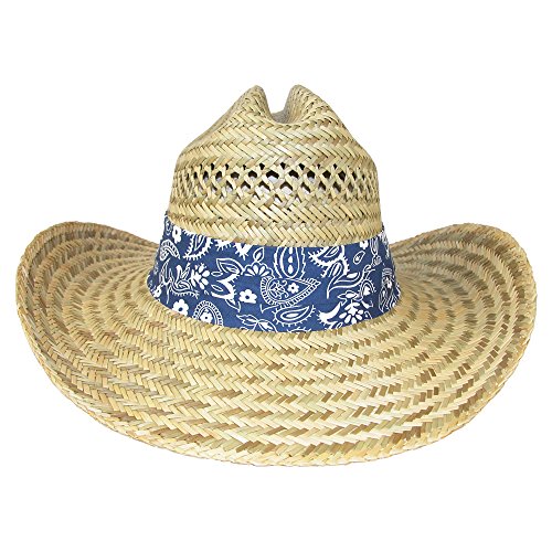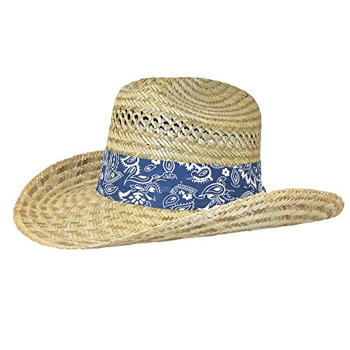Studio : Broner Publisher : Broner Binding : Apparel Product Description Protect yourself from the sun in style with this rancher shaped cowboy hat! It features a vented crown for breathability, interior cloth sweatband, 4.5 inch upturned brim, and bandana print hatband which adds western style. This hat is great for use outdoors and helps keep you safe from the sun with its wide brim. 0