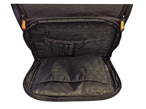 Two-way zip opening into front compartment with padded tablet sleeve and internal organizer pockets