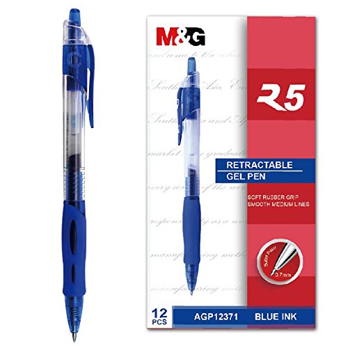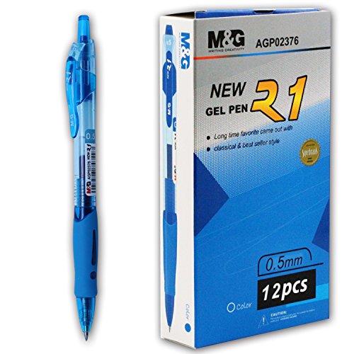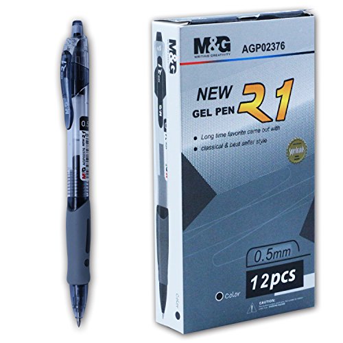 -. Feature : The R-5 retractable gel ink pens from M&G are the perfect writing tool for both personal and business needs / These gel pens are designed to offer the best possible writing experience. Available in packs of 12, these pens are sure to last without the need for replacement. The ink cartridges are refillable as well for extended life. / The rubber grip near the tip of the pens fits comfortably in your hand to keep your fingers from getting sore. The grip also prevents slippage if your hands tend to sweat, allowing for a firmer grasp without strain for greater precision in writing. / These fine point gel pens allow you to write with smooth, clean lines, so your words will always be clearly legible. At 0.7 mm, these pens draw fine lines, even if your handwriting is small. / The gel ink is smear-proof once dry, so you never have to worry about your work becoming illegible due to ink smudges. The ink is water-resistant as well to help prevent smears from minor office mishaps. The gel ink is also acid-free, making it ideal for documentation, record keeping and archives.