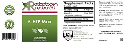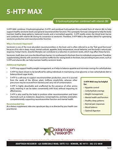 Studio : Adaptogen Research Publisher : Adaptogen Research Binding : Health and Beauty Product Description 5-HTP Max is a synergistic formula of 5-hydroxytryptophan (100 mg) and vitamin B6 (20 mg) for supporting overall neurotransmitter metabolism by providing precursors of serotonin. 0