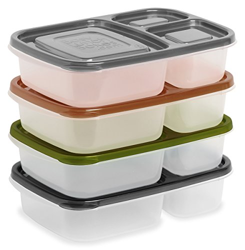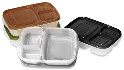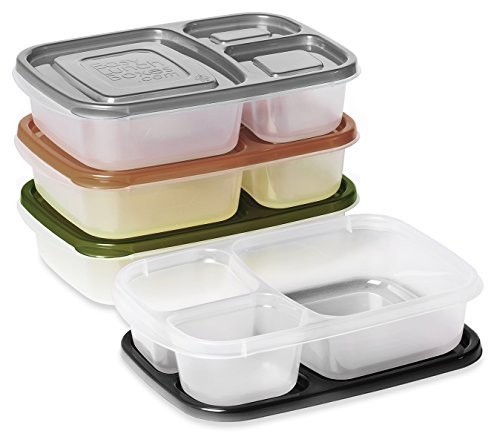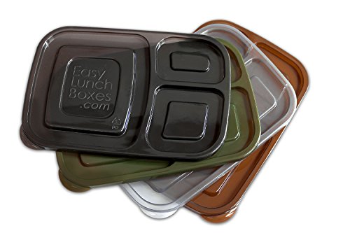 The fastest way to pack a lunch box. Guaranteed. Container lids stay put, but can be easily removed by toddlers. (Not leak-proof). Please do not use with liquid or runny food items. Durable and reusable, the containers are of much heavier quality than similar 'take and toss' products and will last through many months of waste-free lunch packing. Made from FDA-approved, high-quality polypropylene No.5. No BPA, PVC, or phthalates. Microwave, freezer and dishwasher safe. Almost any menu can fit into the compartments. Foods keep separated and don't "touch". Perfect for people with allergies who need breakfast, lunch, and/or dinner packed gluten-free, nut-free, etc. EasyLunchboxes make dieting and portion control easy-just the right amount of food, without having to weigh or measure meals. Quickly assemble healthy and delicious meals to go for school or office lunches, as well as travel, picnics, or family outings. Pack them in the EasyLunchboxes Cooler along with a water bottle, ice block, extra snacks, even a thermos. (Up to three of these compartmentalized food savers fit in the EasyLunchboxes cooler bag.) Each container is 9.4" x 6.1" x 2" Compartment capacities: Large section-2.5 Cups, Smaller section-3/4 cup, Smallest section-1/2 cup. Inside of the largest compartment is approx. 4.5" x 5" Inch and 1.75" deep. (Not leak-proof.).Feature